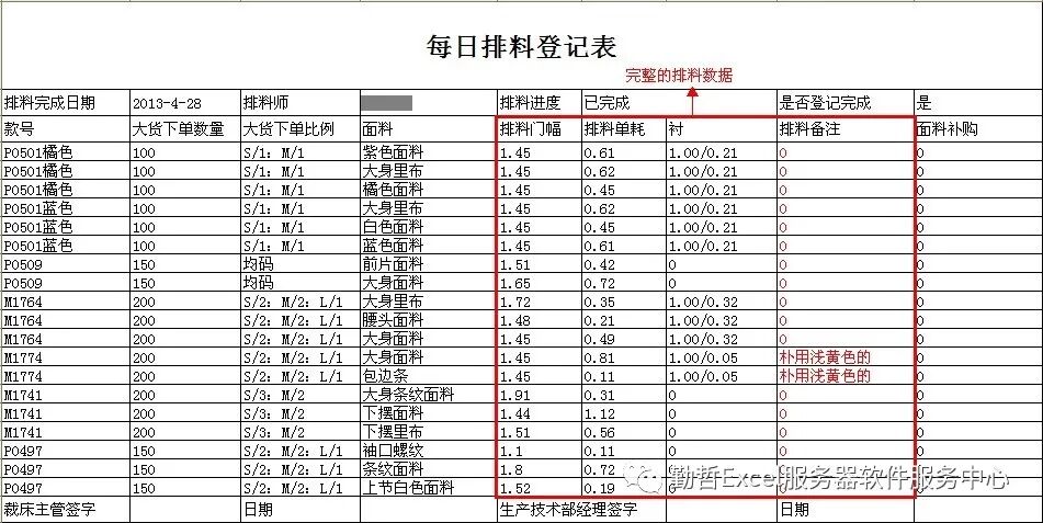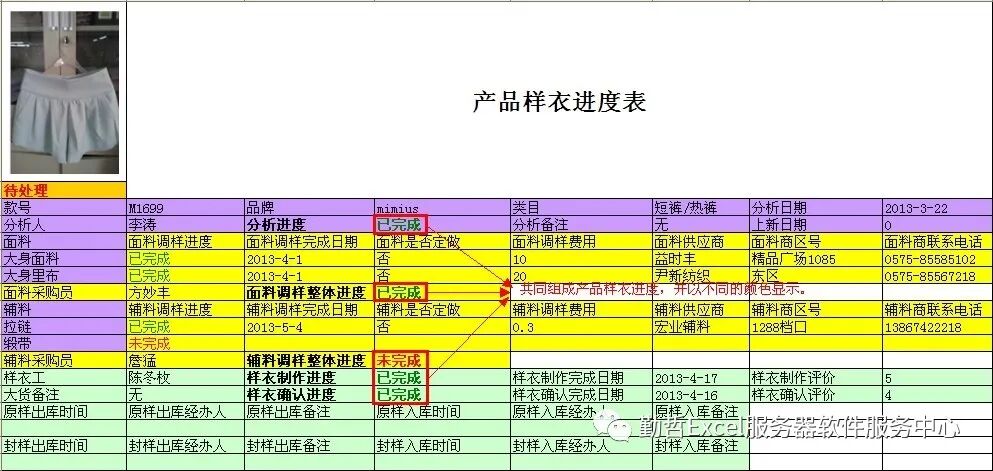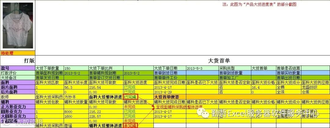 该模板涵盖了产品部所有需进行数据录入的表单,为产品样衣进度和大货进度提供直接的信息来源,通过回写公式完成数据库的更新,也是系统管理员进行系统日常维护的重点。