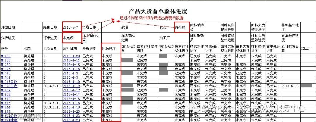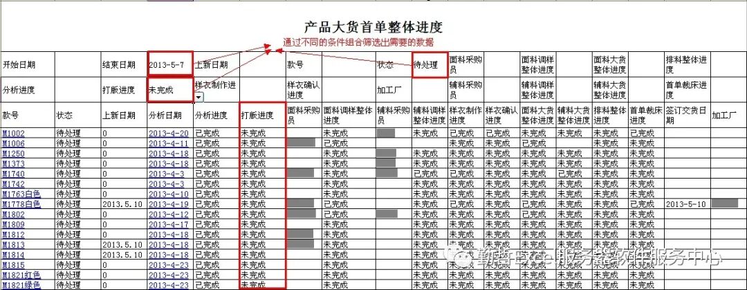 该模块为整个系统的核心,通过数据回写,集合了产品部日常需要的几乎所有信息,其中“产品样衣进度表”主要保存产品样衣的分析、调样、制样以及样衣确认,而“产品大货进度表”则记录了从大货下单到大货补单结束的全过程。