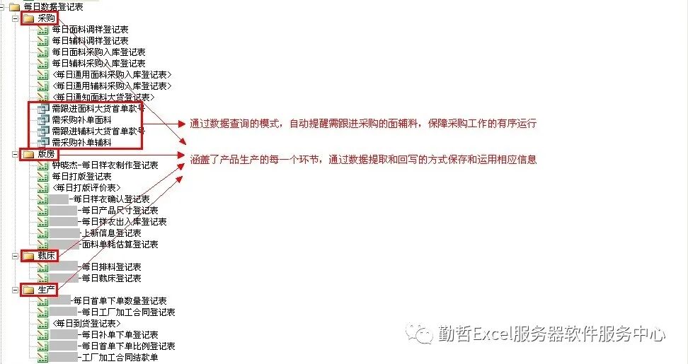 因为勤哲excel服务器是专门为公司产品部量身定制的,因此系统的架构也主要围绕产品生产环节展开,大致分为产品进度、数据登记、数据查询、数据库、资料库5个方面,其中产品进度为系统的核心表单,主要为产品样衣进度以及大货进度,而数据登记则涵盖了几乎所有的生产流程和管理环节,主要包括产品的打版、制样、下单、采购、排料、裁床以及加工。