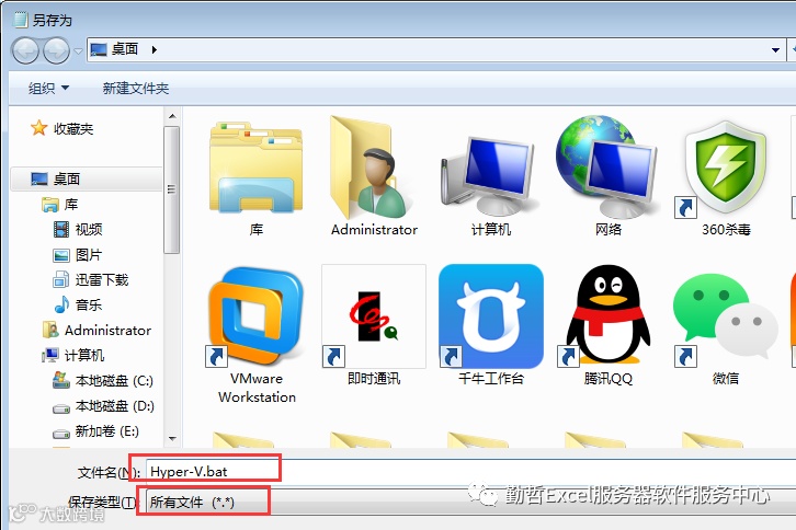 然后将这个文档另存一下,这时就会打开记事本的另存为窗口,在窗口中点击下面的“保存类型”下拉按钮在弹出菜单中选择“所有文件”菜单项,文件名命名为后缀为bat的文件名即可,如:Hyper-V.bat