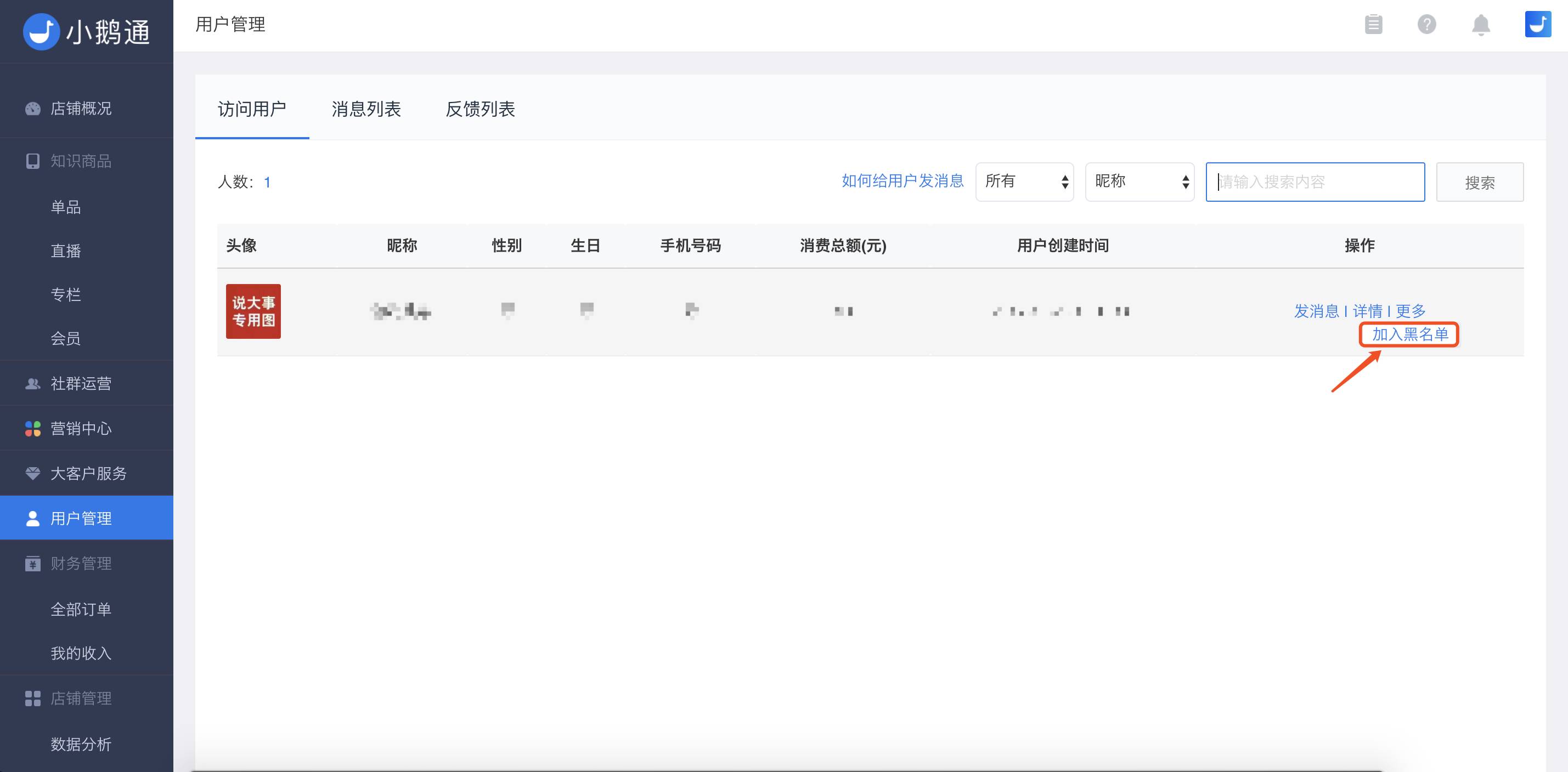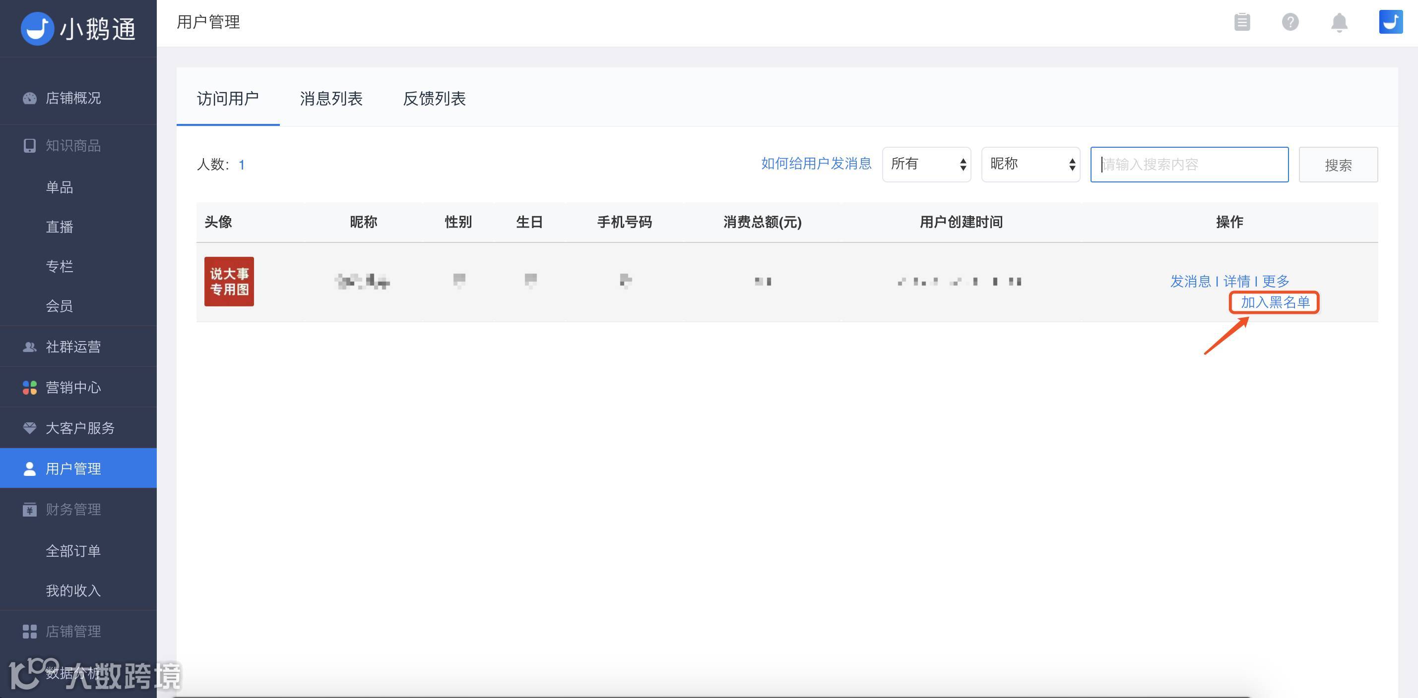 在管理台【用户管理】找到该用户,选择【加入黑名单】。