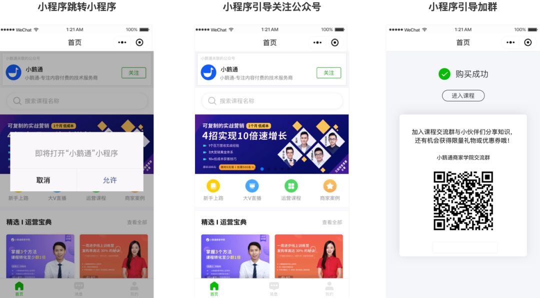 全新的微信小程序课堂打通了公众号、小程序、微信社群,刺激流量增长。商家可以在微页面或购买成功页设置【关注公众号组件】,小程序之间可以相互跳转,互通互联,进而可以打造小程序矩阵。