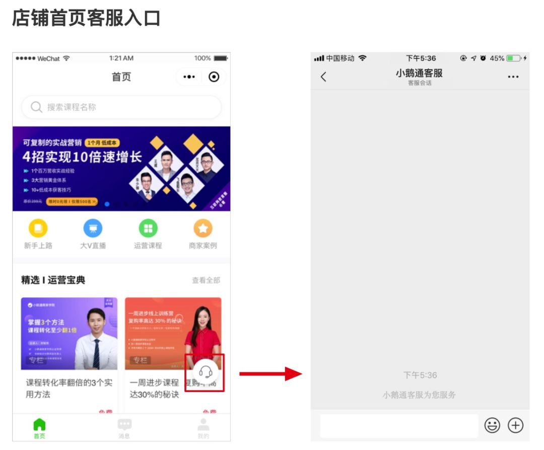 在不远的将来,你只要在「店铺首页」或「课程详情页」配置“微信小程序在线客服”功能,即可给用户提供在线的售后服务,也可以引导用户去H5店铺购买课程,完美解决iOS系统不支持小程序虚拟商品下单的尴尬!