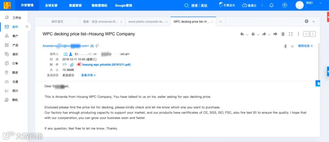 昊轩原先的外贸方式以展会为主,一年参加2-3个外展,再结合网站推广获取客户信息。现如今展会集体取消,网站访客量参差不定,富通天下云平台成了昊轩开拓客户的主要渠道。复工后的Amanda开始使用富通天下云平台开发并积累自己的客户资源。此次出单的客户就是使用云平台开发而来,Amanda向小编详细地描述了客户开发的全过程。