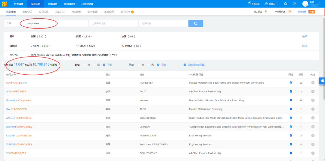 使用关键词“ composites”(复合材料)在【商业数据】里搜索到大量经销商、采购商、供应商的公司名称、公司网址、主营产品、邮箱账号、历史供货商等信息。