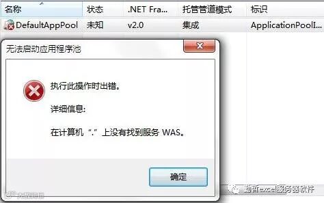 现象:在勤哲Excel服务器配置esweb或iesweb2的过程中,当启动iis应用程序连接池时,有时候遇到报错:在计算机“.”上没有找到WAS服务。如下图: