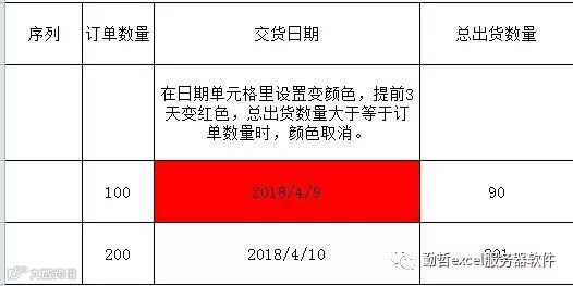需求:在日期单元格里设置变颜色,提前3天变红色,总出货数量大于等于订单数量时,颜色取消。如下图: