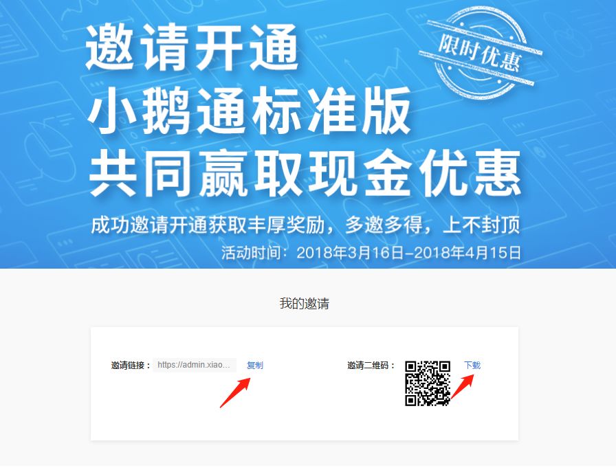 活动时间为2018年3月16日至2018年6月15日,在此期间,您可以在小鹅通管理台随时进入活动页面。(小鹅通标准版客户在管理台可以看到活动入口,进行邀请)