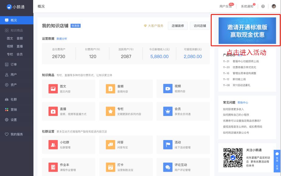 1.为给新老客户带来更多开通版本、购买功能包、续费相关优惠,小鹅通特此推出分享开通获返点活动。即日起至2018年6月15日期间,若您已拥有小鹅通标准版店铺,则可登录活动页面,提取专属的分享邀请链接及二维码;