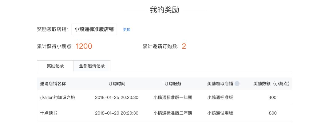 邀请奖励发放到您所选择的奖励领取店铺的小鹅点账户,可在【管理台】-【我的服务】-【小鹅点账户】中查看。