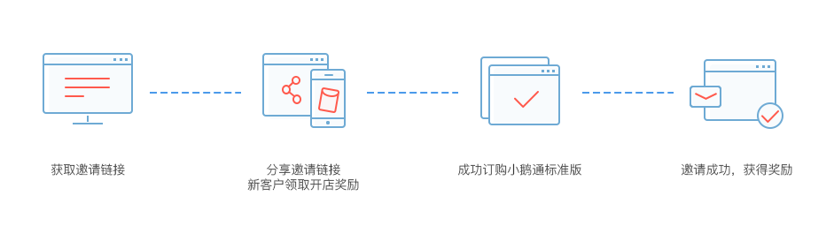 被邀请方成功开通小鹅通标准版,您即可获得相应数额的小鹅点。需要注意,仅有尚未开通小鹅通标准版且尚未领取过开店奖励的才能被成功邀请。
