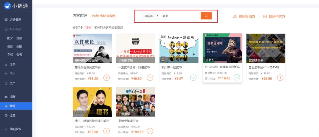 内容方可在管理台直接导入现有专栏商品或新建专栏商品到内容市场。渠道方在采购商品,搜索相关关键词时,就可以看到该课程。