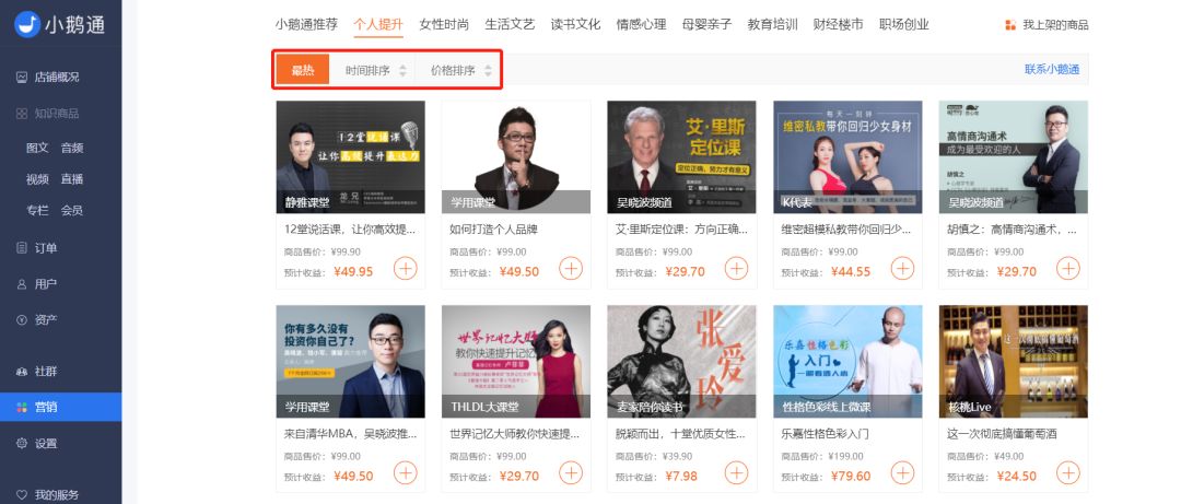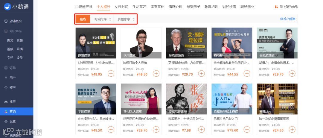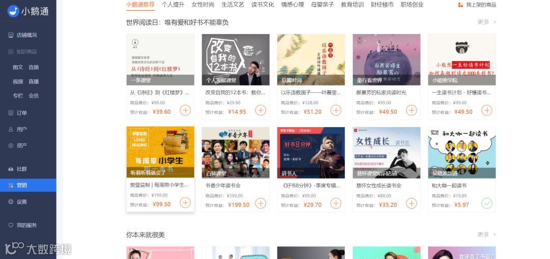 目前已有吴晓波频道、豆瓣时间、咪蒙、张德芬空间、科学队长、网易科技、为你读诗、樊登读书会、丁香妈妈、年糕妈妈、包妈课堂、沪江网校等大咖店铺上传优质课程供分销。