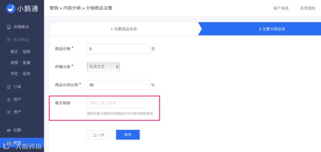 3.【内容方可上传宣传素材】内容方在创建分销商品后可上传公众号推文链接,方便渠道方在自有公众号发文推广。