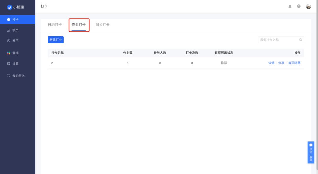 现在,专属打卡小程序已经上线“作业打卡”模式!您可以创建“作业打卡”活动,布置多个作业,并设定有效时间,督促学员尽快完成。登录您的小鹅通账号,并进入打卡小程序管理台,点击即可看到“作业打卡”的列表,如图所示: