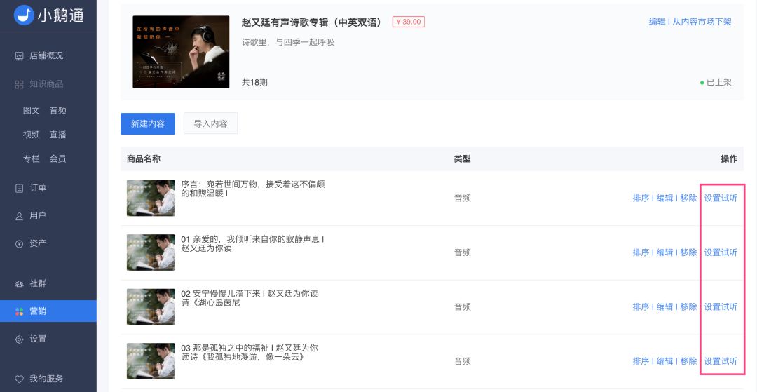 开启试听试看很简单,内容方在【内容分销-我是内容方-商品详情】页面一键点击【设置试听/试看】,内容市场商品展示页及渠道方店铺商品将同步展示试听/试看内容。