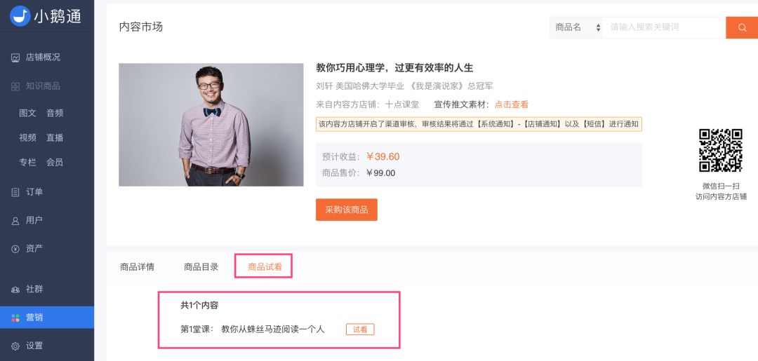 渠道方将知识商品上架到自己的店铺后,用户亦可试看