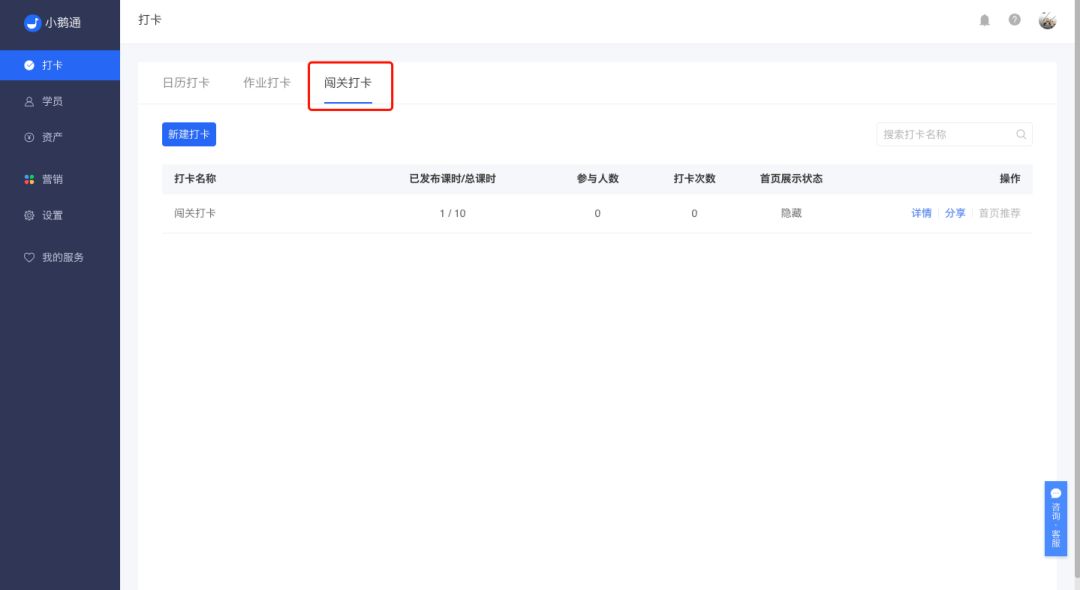 现在,专属打卡小程序已经上线了“闯关打卡”模式啦!登录您的小鹅通账号,并进入打卡小程序管理台,点击即可看到“闯关打卡”的列表,如图所示: