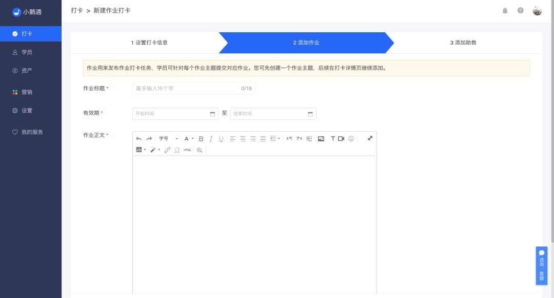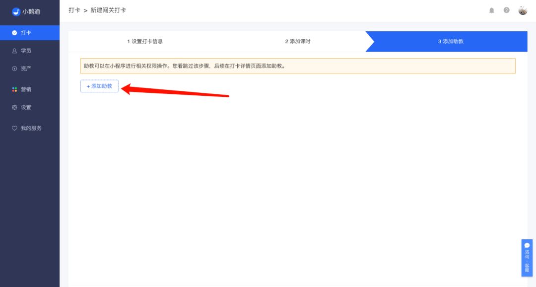 打卡课时设置完毕后,您需要给打卡活动添加添加助教,来完成后面的监督学习、作业批改等等一系列动作。