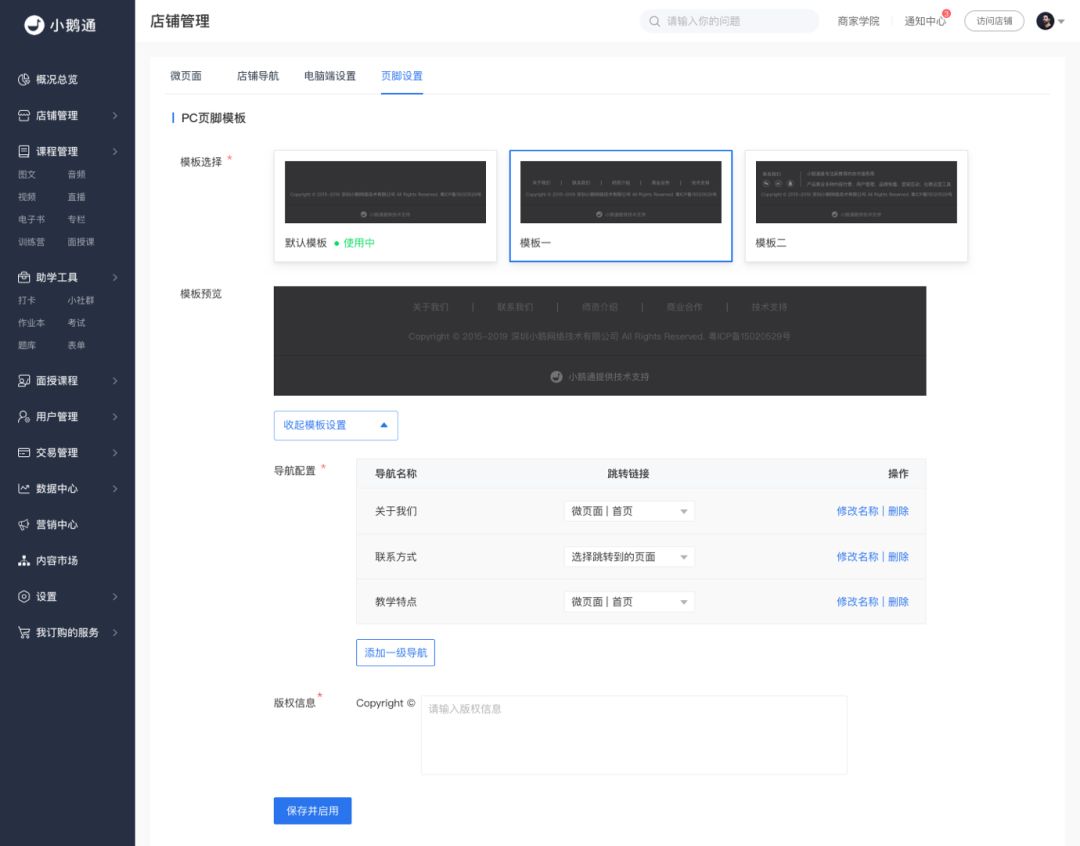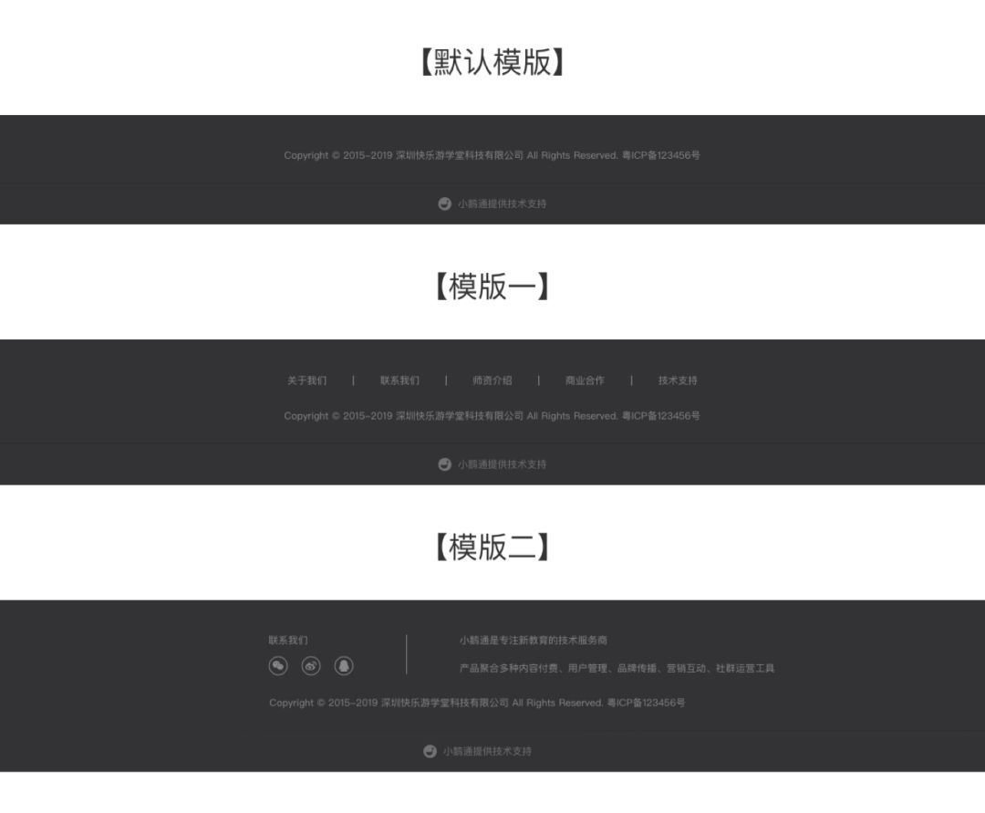 不仅如此,我们还为你增设了页脚版权信息自定义配置。在这里,你可以将你所有的知识成果和品牌标识,尽情向外界传递展示,在万千学员面前更好地塑造自有品牌标识度。