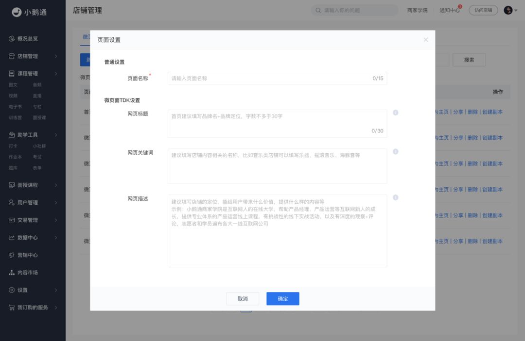 想提升自己专属品牌官网的影响力,并让它在搜索引擎的排名中更靠前?你需要配置一套专属的TDK(Title/Description/Keywords)元素。小鹅通全新PC版网校,支持商家在店铺管理台配置PC版页面的TDK,包括店铺主页和微页面以及各个课程的详情页,全部支持TDK自定义配置!