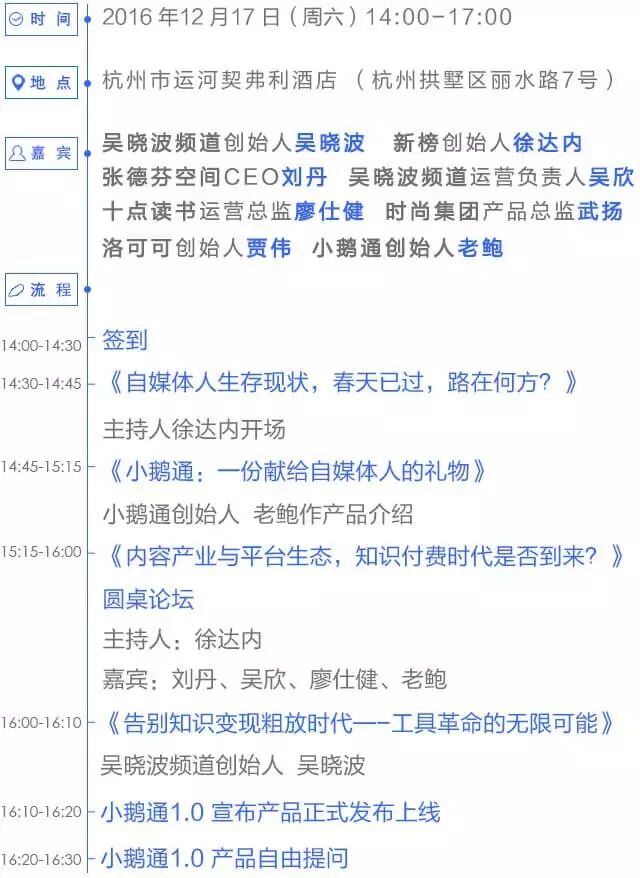 吴晓波频道创始人吴晓波、新榜创始人徐达内、张德芬空间CEO刘丹、吴晓波频道运营负责人吴欣、十点读书运营总监廖仕健、时尚集团产品总监武扬、洛可可创始人贾伟、小鹅通创始人老鲍等嘉宾将联合小鹅通1.0产品发布,于12月17日的杭州一同为您开启自媒体工具革命之旅。