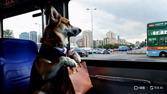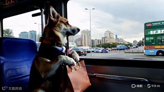 “拟人化的穿着西装的狗,提着包在公交车上,窗外是飞驰而过的城市”