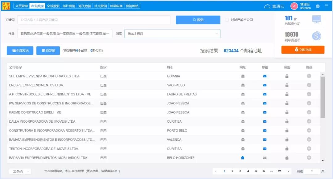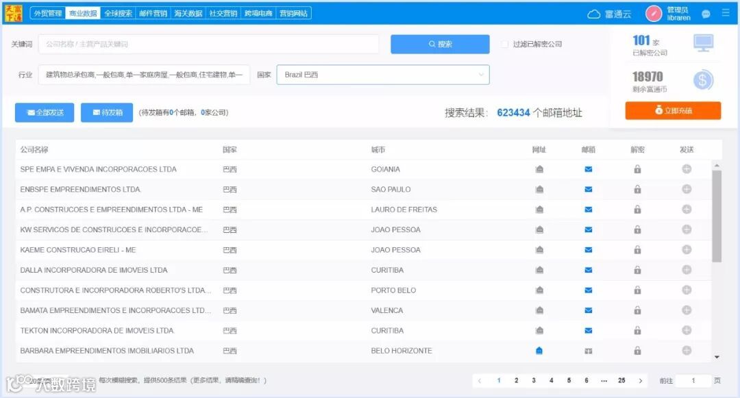 云平台针对任何关键词搜索,都自动翻译成100多种语言,在全球主流搜索引擎(比如Google、Yahoo、Bing、Yandex等)及行业站点中,搜索包含相关关键词的网站,并抓取公司邮箱等重要信息,完全省却了用户切换搜索引擎、手动翻译之赘。特别,用户针对搜索结果,可以事先设定营销邮件模板、发送时间计划,系统实现了“从搜索到发送”的全自动无人营销。