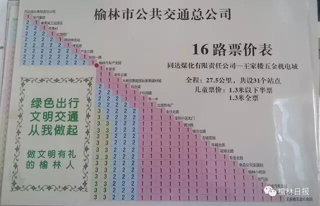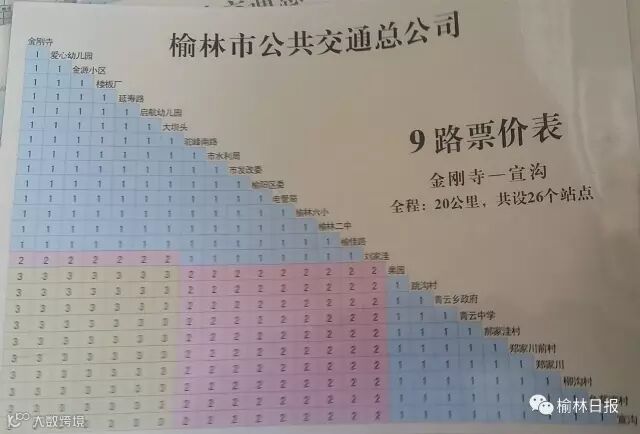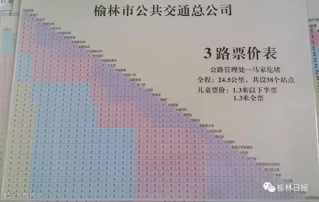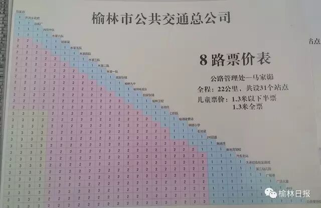 公交公司运营部郭部长表示,榆林城区现在共有20条公交线路,其中3、8、9、14、16、17路为乡镇线路,分段计费。3路车从公路管理处到马家圪堵,共38个站点,最高票价4元;8路车从公路管理处到马家峁,共31个站点,最高票价3元;9路车从金刚寺到宣沟,共26个站点,最高票价3元;14路从榆林中学到闫庄则小区,25共站,最高票价3元;16路从同达煤化有限责任公司到王家楼五金机电城,共31个站点,最高票价3元;17路从刘官寨到榆林中学,共37站,最高票价2元。