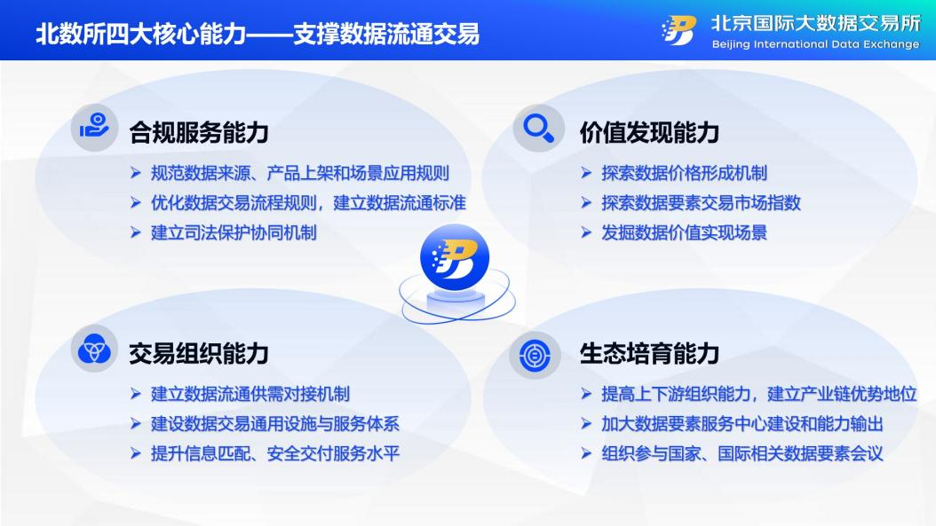 目前,北数所以“建设国家级数据交易所”为核心目标,致力于“打造国内领先的数据交易基础设施和国际重要的数据跨境流动枢纽”。为数据市场提供专业化服务。目前已构建合规服务、价值发现、交易组织、生态培育四大核心能力,形成从产品开发到撮合交易、交付的数据交易全链条服务体系,打通从资产登记到评估、入表的数据资产全过程管理路径,聚焦高频数据交易、人工智能高质量数据集供给、高价值跨境数据流动三大业务板块,并取得了一系列成果。