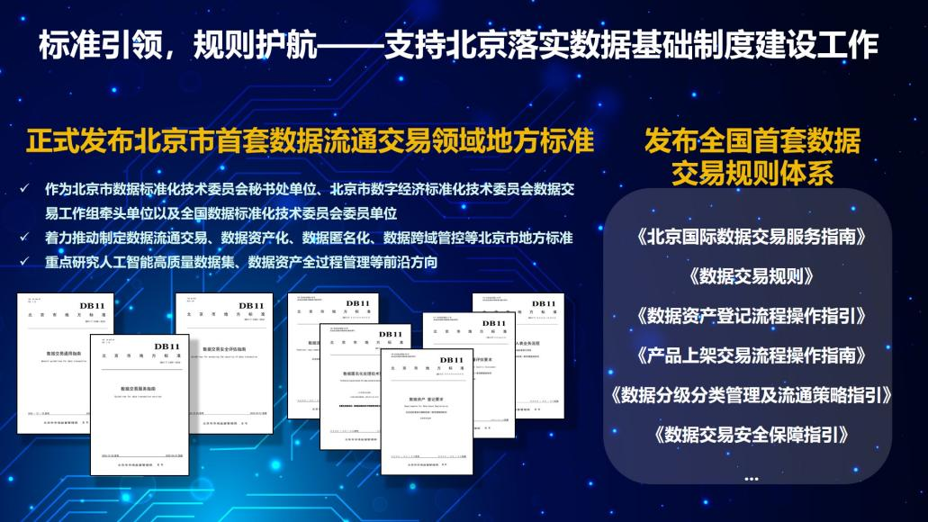 目前,由北数所牵头编制的3项数据交易地方标准已于2024年底发布,成为全国首批数据要素流通领域的地方标准。同步落地标准验证案例25个,在国内率先形成“标准引领--市场规范--业务落地”的数据要素标准化业务闭环。
