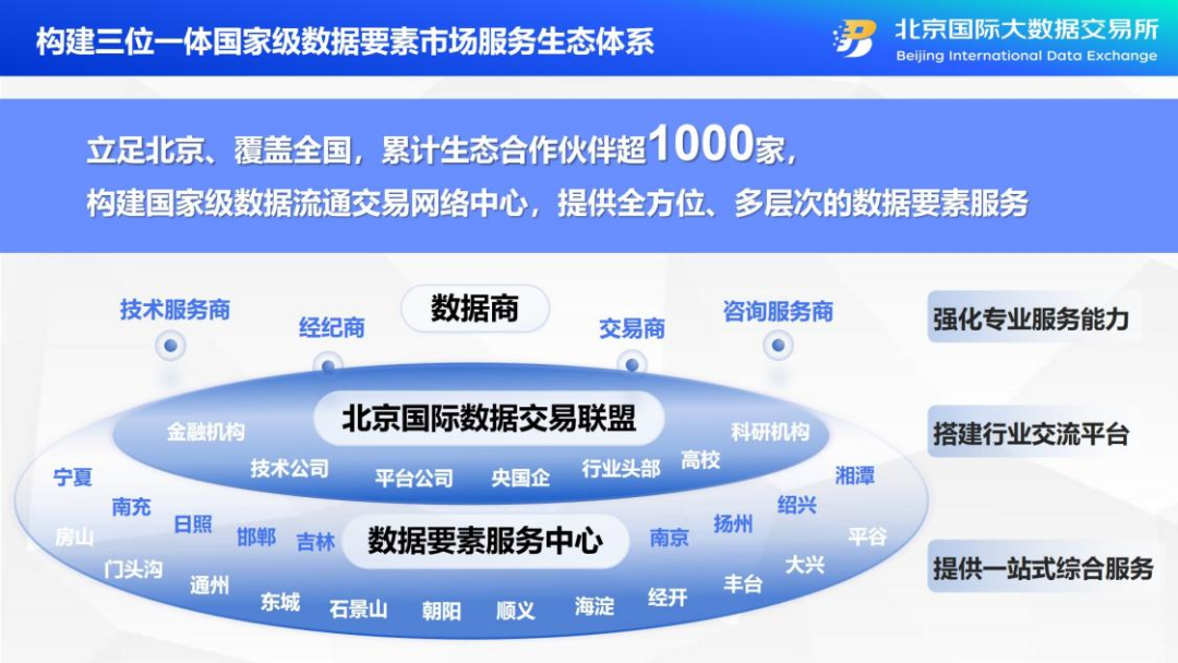 为活跃数据要素市场,北数所积极培育“三位一体”的数据要素生态伙伴,持续吸纳北京国际数据交易联盟成员至300多家,围绕重点行业培育高规格、多层次的数商伙伴700多家,在全国范围内建设区域数据要素服务中心21个,高标准打造“立足北京、辐射全国”的数据要素市场服务生态圈。依托全球数字经济大会、中关村论坛、服贸会等高端平台,积极展示最新成果,推动提升产业能级,助力首都扩大数字经济伙伴城市“朋友圈”。