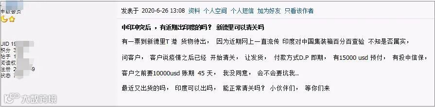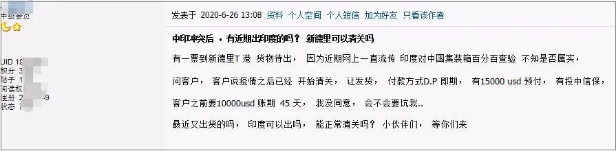 城门失火殃及池鱼,边境冲突显然已经影响到做印度市场的中国外贸企业。近期与印度客商合作,要注意风险。
