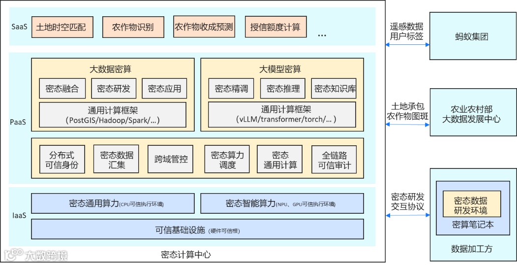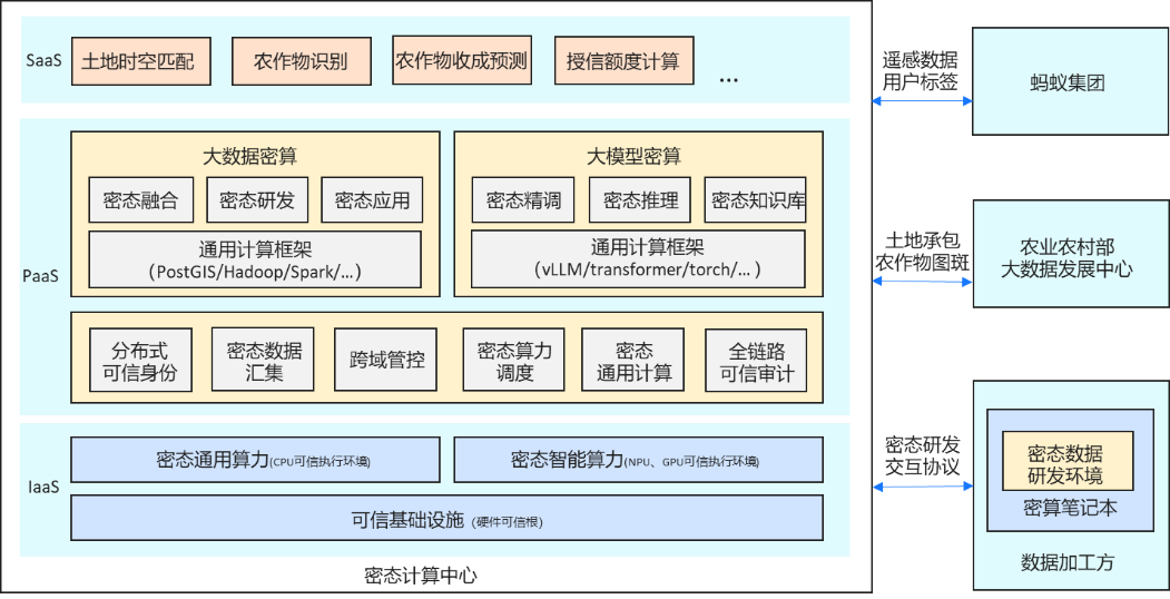 密态SaaS层提供服务高价值高敏感数据的密态数据空间,用于实现与场景相关的具体数据业务功能。在本案例中,密态计算中心通过空间匹配,获得特定农户的农作物图像,并对农作物种类进行识别,以及对农作物的收成进行预测,基于农作物收成及农户的其他信息,计算农户的授信额度。