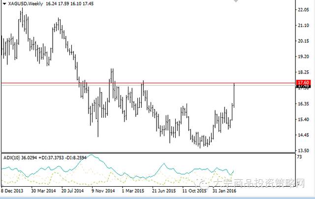 2016年初贵金属市场一直是黄金起领涨作用,不过进入到4月之后,白银突然飙升,短短1周的时间内多头已经连续攻克16和17两道整数关口,若进一步突破17.73美元/盎司的话则将刷新一年半新高,今年涨幅已经超过20%,进入技术性牛市。