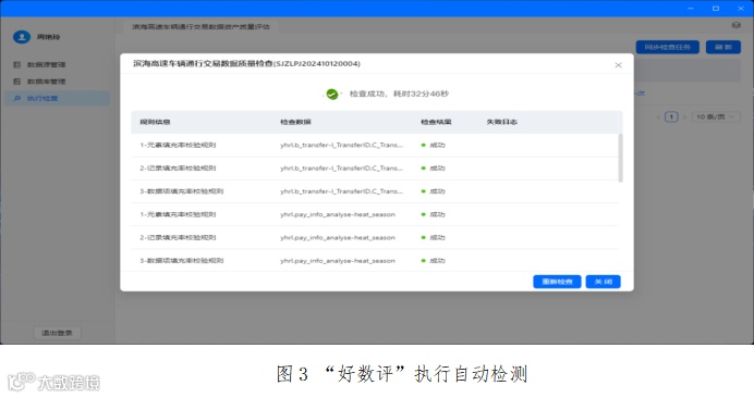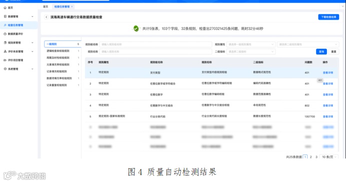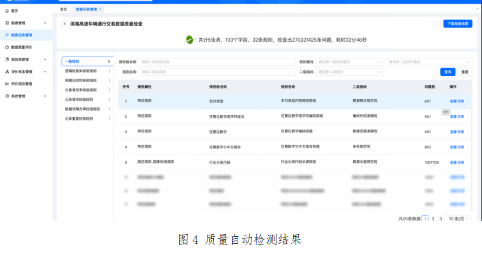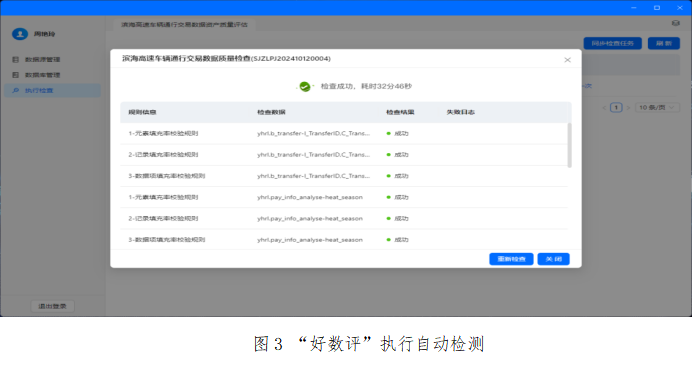 按照数据字段特征在“好数评”中配置数据资产质量评估规则,对高速车辆通行交易数据进行自动化检测,“好数评”按照设定的规则对数据字段进行逐一检查,自动形成检查结果,包括检测的数据情况。