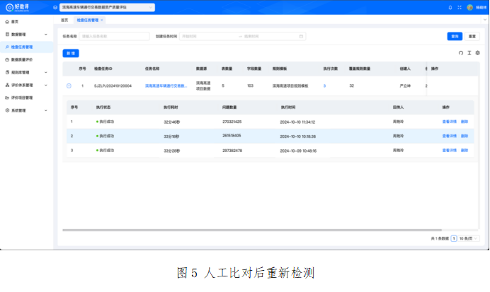 运用中电数创自主开发的数据资产质量评估工具“好数评”,根据评估要求和评估指标体系,在“好数评”中配置相应的评估规则和算法,利用工具对滨海高速车辆通行交易数据进行自动化检测和分析,同时结合人工审核,确保评估结果的准确性和可靠性。