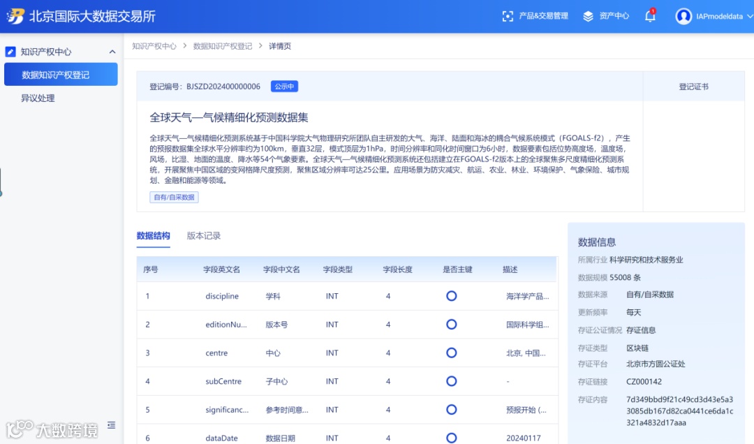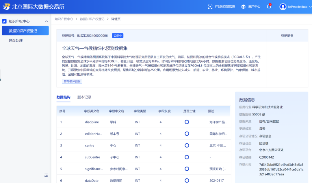 为响应国家加强数据资产管理、促进数字经济发展的政策,遵循《中共中央国务院关于构建数据基础制度更好发挥数据要素作用的意见》《北京市数字经济促进条例》《知识产权强国建设纲要(2021-2035年)》《北京市知识产权保护条例》等政策要求,依据《北京市企业数据知识产权工作指引(试行)》和《北京市数据知识产权登记管理办法(试行)》等制度文件规定,在北京国际大数据交易所积极推动下,中国科学院大气物理研究所全球天气—气候精细化预测数据集经过严格的合规、技术、质量等审核在北京市知识产权保护中心获得授权,这既是我国气象领域首个获得授权的数据知识产权登记证书,也是中国科学院首个数据知识产权登记证书,更是北数所与北京市知识产权局、北京互联网法院签署数据知识产权合作框架协议,开展数据知识产权登记试点工作、共同实现互认互信的打造绿色通道的典型案例。