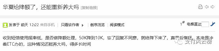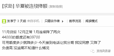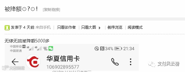 华夏的风控历来很宽松,但此次华夏信用卡突然降额有些很蹊跷,首先是事先银行无任何预警短信,再就是好多卡友反应自己并没有违规套现也没有长期空卡。另外值得注意的是很多卡友表示被连续降额。