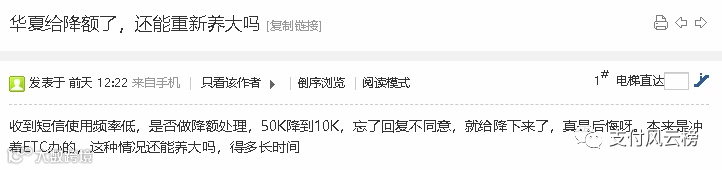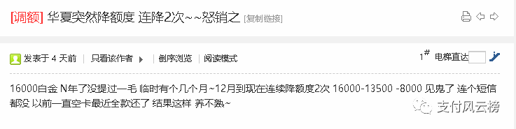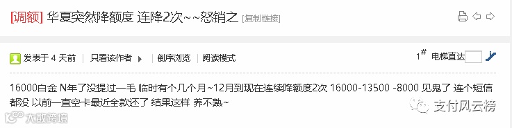 一向低调的华夏信用卡也加入了降额的阵营,来的悄无声息,没有一点点防备!早在去年12月,已经陆续有持卡人表示华夏信用卡额度被降,但毕竟数量不多,看来华夏上个月的降额是试探性,而新年的此波行动,有点“全面清剿”的态势。