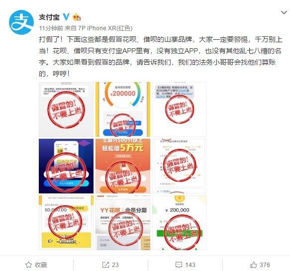支付宝官方微博打假,这些都是假冒花呗、借呗的山寨品牌,大家一定要警惕,千万别上当!