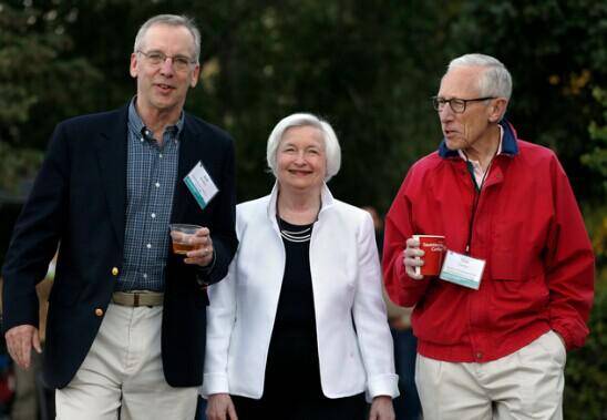 图:美联储三巨头会前谈笑风生,从左至右:三把手杜德利 掌门人耶伦 二把手费希尔