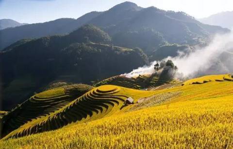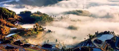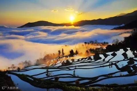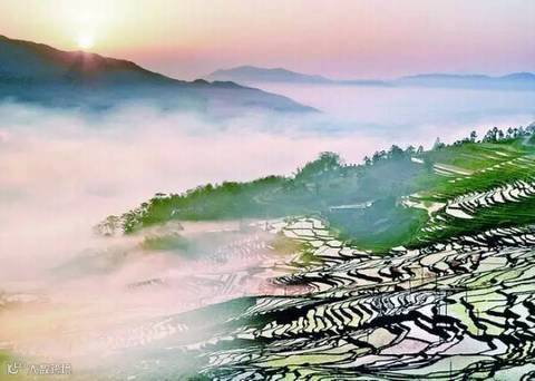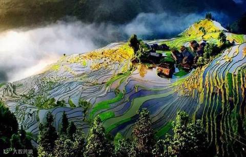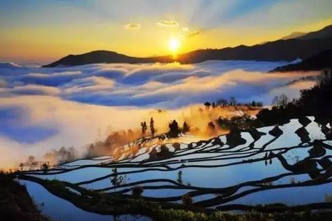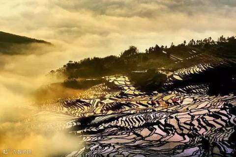 当太阳呈逆光角度驱散晨雾,层层梯田便渐渐染上金光,坐落其间的哈尼族彝族山寨,被云雾掩映得扑朔迷离,如诗如画,如梦如幻。