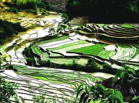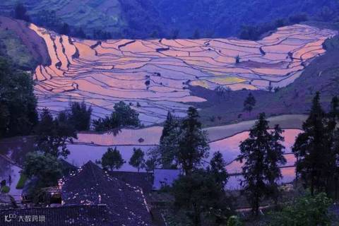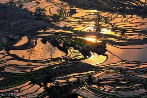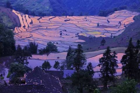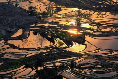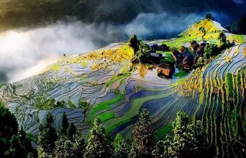 在斜阳和彩霞的映照下,连片的梯田就像是浩瀚的大海,雄伟壮丽,各种有节奏的层次和美妙曲线,五彩斑斓的颜色搭配,常让人目瞪口呆,不知身在何处。