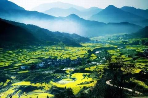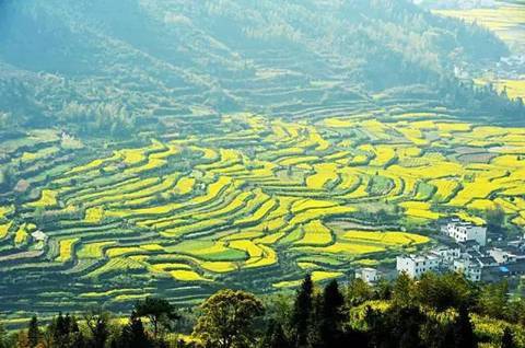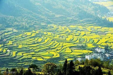三月金灿灿的油菜花遍布田野,从山顶铺散到山谷下,油菜花层层叠叠,一望无际。