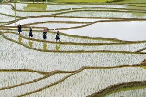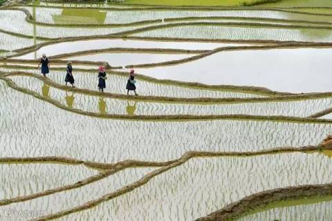 在早上,披着霞光晨耕的农夫唱着山歌,吆吼着水牛,在金光灿灿的梯田中耙耕……此情此景,用任何语言描写都显得苍白无力。