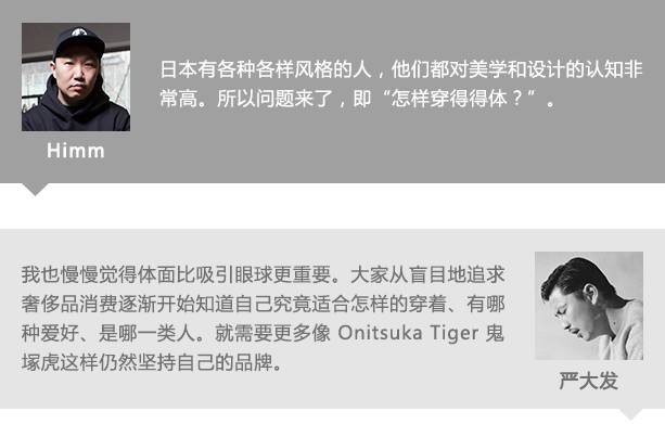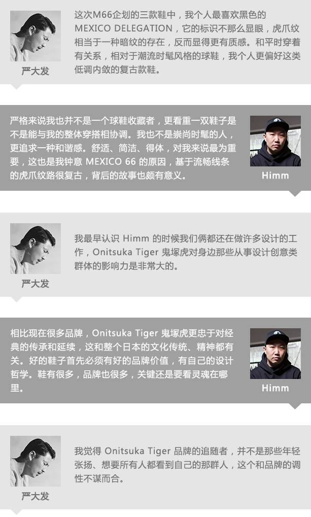 潮流杂志创始人 Himm 与创意人严大发都对虎爪纹情有独钟,两位潮流“老法师”促膝长谈有关虎爪纹50周年和球鞋文化。三组不同领域的创作访谈结束之后,你是不是也对虎爪纹有了不一样的看法了呢?