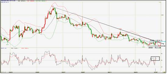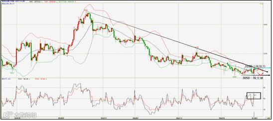 区间在箱体小三角形收敛之后形成短线突破,但在盘中测试3110(15.82)阻力未果,在收市阶段再次回落至三角形突破上轨道位置。整体区间依然震荡,日内操作上还以看空为主,操作上可以在:一下跌破掉3080(15.66)一线做空,或者在盘中阻力一线3108一线做空,目标都看向3030位置一线,止损点在3124一线附近。仓位不要过大。注释:带有括号的数字代表白银美元报价的位置