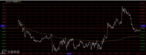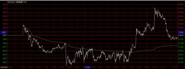 上周日公投之后,昨日希腊问题持续发酵,晚间公布的美国经济数据总体不及市场预期,美元下挫,现货白银冲高回落,小幅收跌。亚盘时段,现货白银高开高走,触及3100整数关口之后震荡下行并达到日内最低点3058,后企稳上行,欧盘时段现货白银基本在3070附近小幅整理,美国经济数据公布之后,现货白银快速上涨并达到日内最高点3120,后由高点快速回落至3080一线,收盘收于3088。