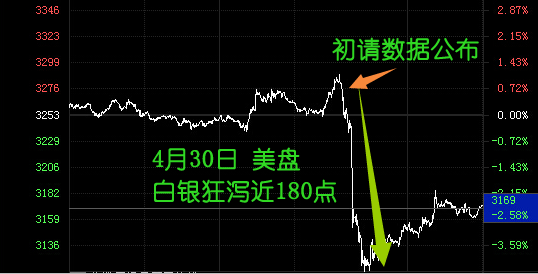 今晚20:30,美国又将公布一重要就业经济数据——“上周初请失业金人数”,我们简称初请。初请恐怖吗,对白银影响大吗?我们来看看4月30日初请数据公布后白银的行情,如下图